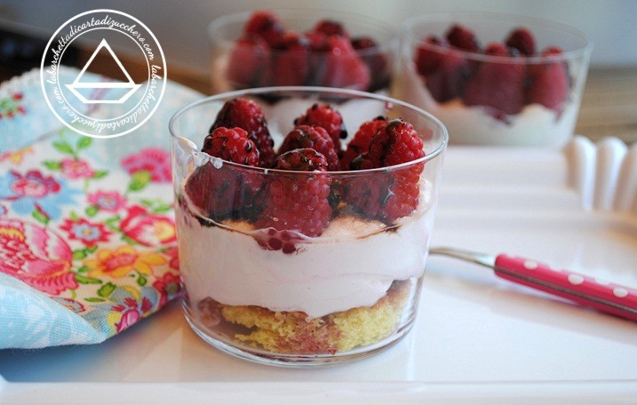Inserite nei bicchierini i dischi di pan di spagna che avrete tagliato a misura con un coppapasta. Unite 1/2 bicchierino di sciroppo di lamponi con il succo di limone e usate il liquido per inzuppare i dischetti.