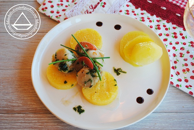 - Preparate la sera prima un pochino di polenta gialla seguendo la ricetta che troverete nella confezione della stessa e fatela rafreddare, tagliatene una fettina dalla quale con un coppa pasta ricaverete tre cerchi che procederete a grigliare e che poi disporrete a fiore sul piatto.