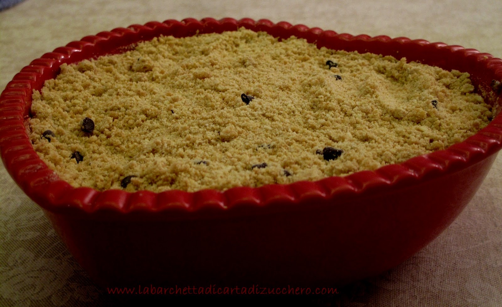 Il crumble rappresenta al meglio l’insieme di queste cose, è vero che è un dolce d’oltremanica e non nostro tradizionale, ma la mia nonnina lo avrebbe adorato e adottato subito, ne sono sicura, sostituendolo alla sua torta alle pere e cioccolato. Quelle briciole burrose e ancora calde, accostate al dolce agro della frutta calda che c’è sotto, un po’ una sorpresa che si scopre affondando il cucchiaio. Quando poi si vuole esagerare, basta aggiungerci una bella pallina di gelato alla vaniglia, abbinamento strepitoso!!!