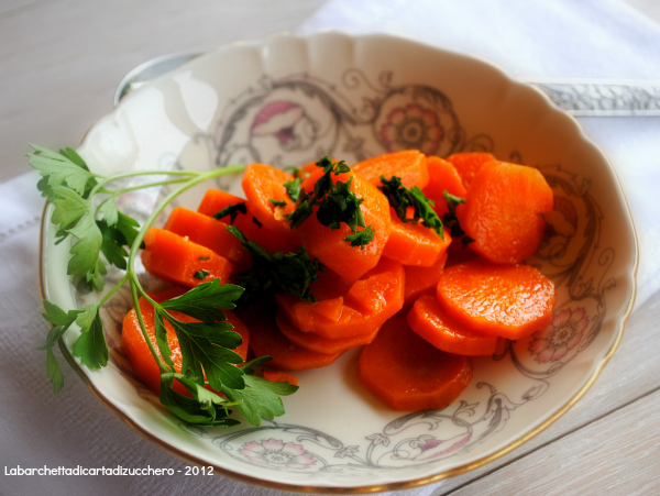 Ecco là, anche io ho fatto i miei buoni propositi e vi lascio con questo contorno delicato che contiene una nota insolita, che assomiglia tantissimo alle carote al burro che ho sempre fatto e che piacciono tanto anche ai bimbi, ma che di solito si considerano veramente un piatto banale, non degno neanche del pranzo della domenica.