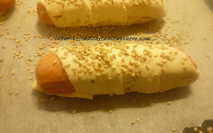 Prendete la pasta e stendetela, ricavatene delle striscioline di circa 3 cm. di larghezza che andrete ad avvolgere attorno ai wurstel in maniera un po’ lasca (i wurstel tendono a gonfiarsi in cottura quindi diamogli un po’ di spazio) in diagonale.  Mettete sulla placca del forno e fate lievitare encora per circa mezz’oretta.