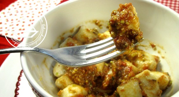 Mescolate assieme tutti gli ingredienti, con le mani infarinate arrotolate l’impasto in piccoli salsicciotti e tagliateli a tocchetti di circa 2 cm. Immergeteli nell’acqua bollente e man mano che affiorano scolateli con la schiumarola e conditeli con il pesto di pomodoro.
