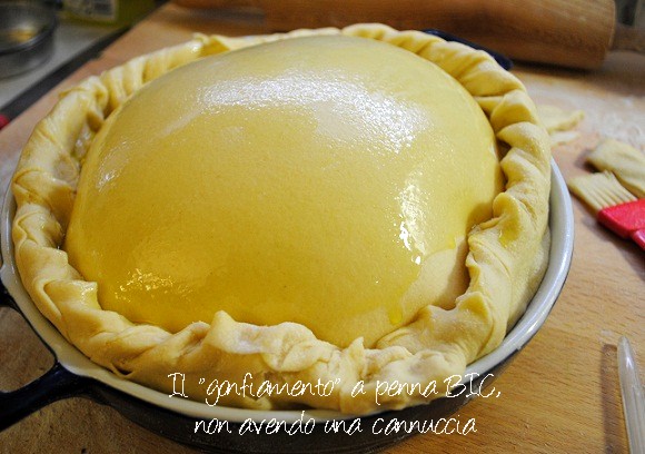 Quando è ben gonfia come un palloncino togliete rapidissime la cannuccia e sigillate l’apertura.Infornare a 180° per 40-50 minuti o fino a doratura della pasta.Appena tolta dal forno spennellate delicatissimamente di olio. Raffreddandosi la pasta si ammorbidirà e, se l’avrete fatta abbastanza sottile, scenderà come un velo!Alla fine della fiera vi dico che era veramente buona, anche se poi oggi, dopo una ripassatina in forno era anche migliore, lo so che oramai dovrei conoscerlo ma il mio forno mi imbroglia sempre, maledetto!