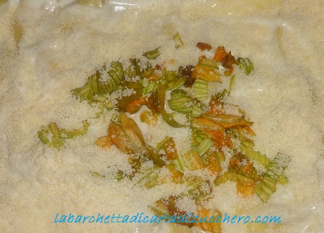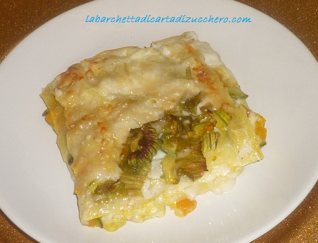 mettete sul fondo della lasagnera un cucchiaio di besciamella e stendetela e poi procedere con la lasagna, uno strato piuttosto ricco di besciamella, il composto di verdure circa 4 cucchiaiate e dei cubetti sparsi di taleggio. Ripetere gli strati fino a esaurimento degli ingredienti. Sull’ultimo strato mettere un pò di besciamella, spargere abbondante Grana Padano grattugiato e come decorazione tagliuzzare dei fiori di zucca e mettere al centro.