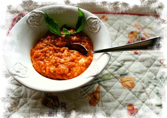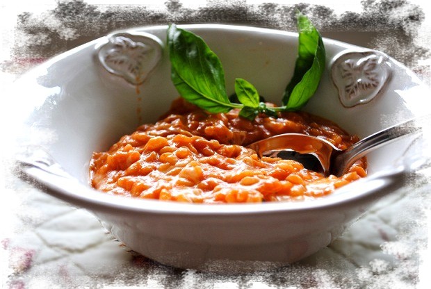 Il Capo, hainoi, proviene da una famiglia di orgogliose donne veneziane molto brave a cucinare. La sottoscritta invece, da una famiglia in cui la madre considerava la cena un enorme peso se la preparazione della stessa richiedeva più di 5 minuti esatti di orologio… Se da una parte la cosa mi ha stimolato, perché la mia passione culinaria è nata dal materno disinteresse, però mi ha anche lasciata completamente priva di una qualsivoglia base data dalla famigliarità. Mi mancano cioè tutte quelle tradizioni legate al passaggio di consegne tra madre e figlia e addirittura nonna, quei sapori antichi, i racconti… è vero che la mia magica nonna Agnese che purtroppo non c’è più, qualcosa mi aveva insegnato, ma è anche vero che riteneva più utile vedermi con la testa sui libri che non tra le pentole, quindi mi aveva insegnato pochino anche lei. Passatemi l’introduzione, ma è necessaria per spiegarvi come mai io sia andata così in fissa in questi anni per la preparazione di uno dei piatti più semplici della cucina, e cioè il risotto al pomodoro. Per quanto provassi e riprovassi, non mi veniva mai bene come quello della Nonna Elsa, che era più saporito, non sò… insomma più buono e niente da fare, non mi veniva. Poi, qualche mese fa, ho incontrato la magica Tessa Kiros, che dalle pagine del suo libro “Ricordi in cucina” mi ha svelato il segreto di un risotto al pomodoro che non è quello della Nonna Elsa, no, ma è…..PIU’ BUONO!!!!!
