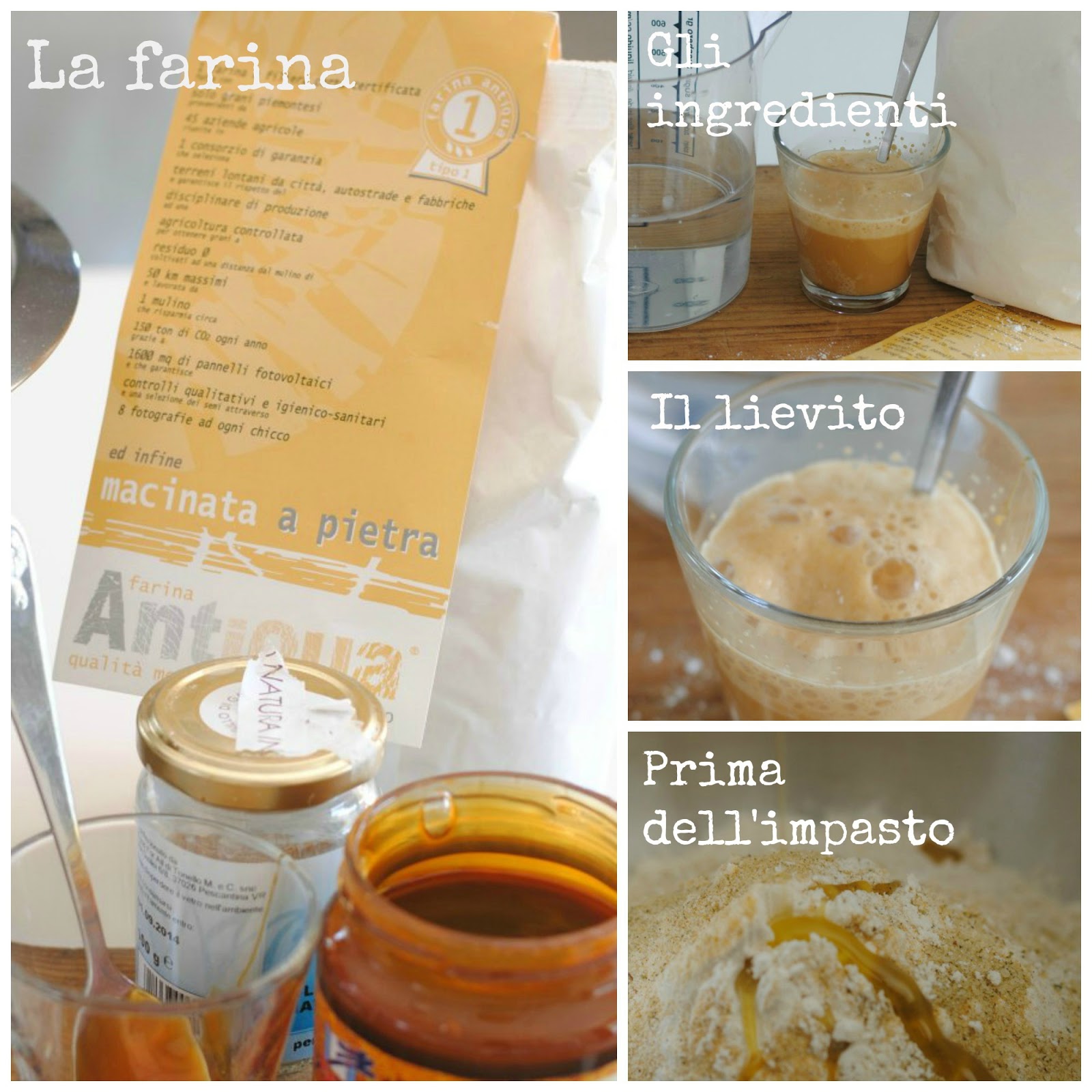 Forse sapete e forse no, che oramai da qualche mese sto approcciando l’avventura della panificazione. Come mai ancora non posto pani particolari??? Bè, perché per il momento il mio fondamentale scopo è quello di ottenere un eccellente pane integrale ricco di fibre e nutrienti da dare a Filippo, il N.1, che altrimenti mangerebbe troppo pane bianco… Anche questa cosa ovviamente si colloca all’interno della mia ricerca di una modalità di alimentazione più sana e naturale, più controllata e tracciata. Francamente sono arcistufa di fare la spesa e pagare solo la marca, perché poi di prodotto alla base non rimane niente, tolti i costi della pubblicità. Questo mio nuovo indirizzo in realtà sta portando anche il blog a percorrere strade che solo un anno fa non avrei percorso. Una di queste è la ricerca di una farina di qualità, e cercando in internet avevo trovato i produttori di farina Antiqua. Per farvi capire il motivo del mio entusiasmo guardate la foto sotto dove sono riassunti tutti e 13 i motivi per cui mi ha affascinata come prodotto, forse le 8 fotografie a ogni chicco sono anche troppe…. però la macina a pietra, oltre a essere parte della nostra tradizione è anche l’unico modo di macinare in cui la farina conserva intatte le sue proprietà, e integri i suoi elementi. Inoltre, come negarlo, è anche di grande poesia. Mi è capitato l’anno scorso di vedere un mulino a pietra in funzione e sono rimasta a bocca aperta…