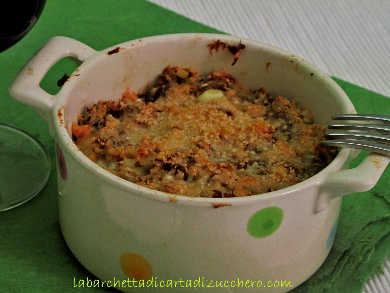Prendete delle coccottine monoporzione e oliatele, riempitele con il composto ottenuto e spolverizzate di grana padano.