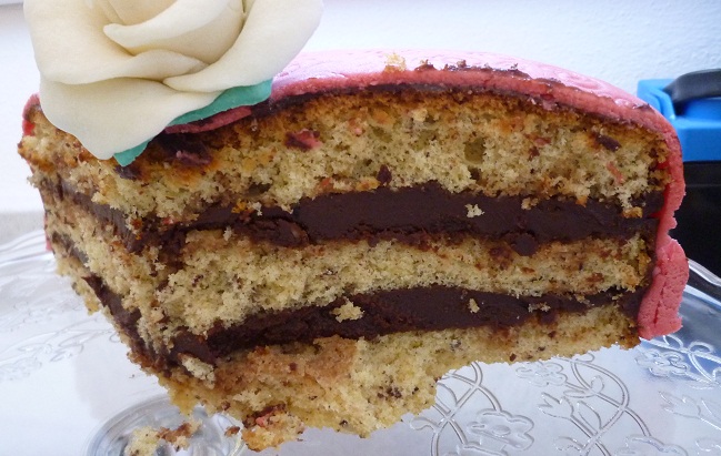 Poi ho fatto un pan di spagna in montata media, secondo ricetta di Luca Montersino, mio mentore e guida, e ci ho aggiunto un pò di farina di nocciole. 3 strati ripieni e ricoperfti di ganache al cioccolato al 70%… leggerina no? Ma devo dire che ci siamo leccati tutti i baffi…