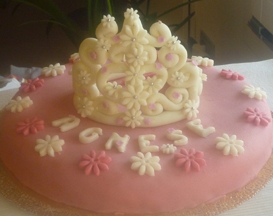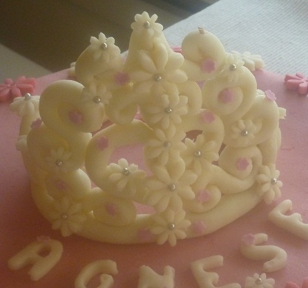 pasta di zucchero rosa e bianca a formare copertura e numeri e lettere, e poi lei, la coroncina…