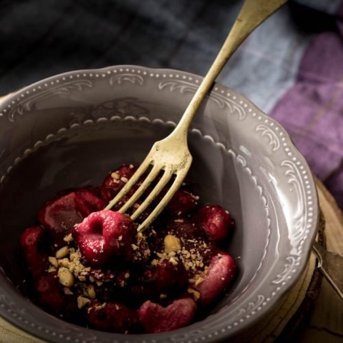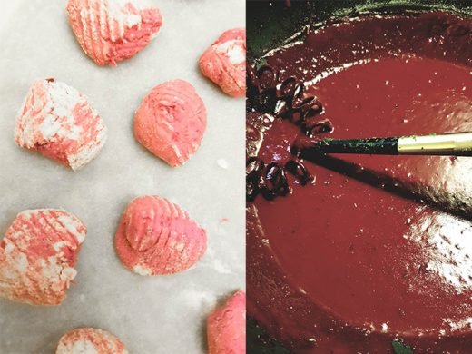 Tutta la barbabietola, succ e scarro dell'estrazione, per un piatto di gnocchi di un colore che grida passione