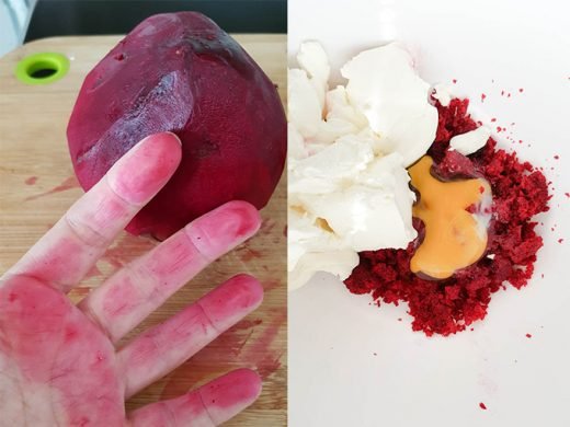 Pelate le parti più dure e terrose della barbabietola, quelle che non siete riuscite a lavare bene, il resto della buccia lasciatelo. Tagliatela a pezzettoni, estraetene il succo in un estrattore (o centrifuga) e conservate lo scarto.