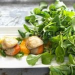 Preparate i piatti con un fondo di crema di carote, le capesante e contornate con del soncino condito con olio, sale e pepe.