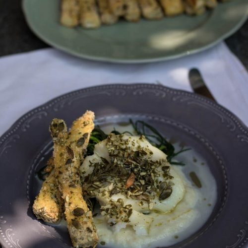 Adagiate il cuore di merluzzo su una teglia rivestita di carta forno, salate, pepate. spargetevi sopra la restante parte dei semi di zucca pestati grossolanamente, condite con un filo d'olio e i rametti di santoreggia rimasti e infornate a 180° per circa 20 minuti.