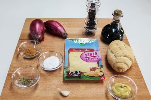 Tagliate il panino, stendete un velo di senape su entrambi i lati, farcitelo con due fette di formaggio e il cippollotto tiepido.